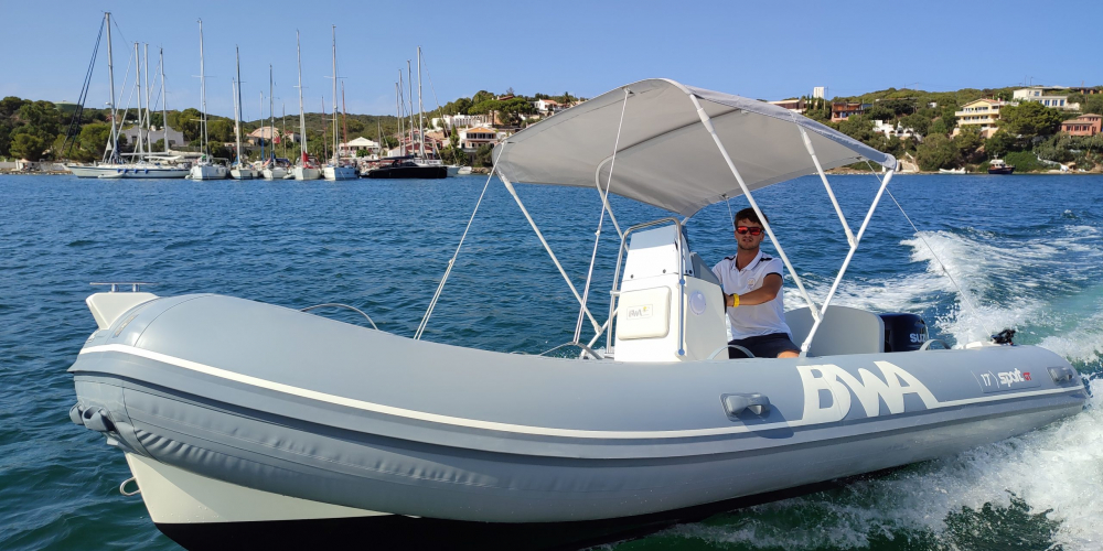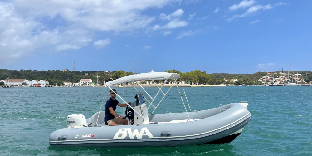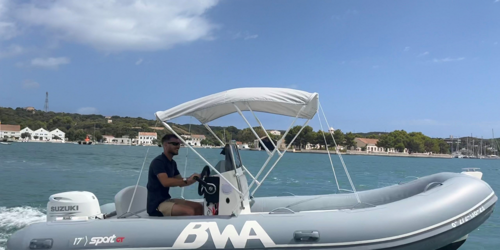 Es la hermana pequeña de la BWA Sport 19 GT incorporando como sus mayores el diseño y estructura e incorpora el tubular especial gris rugoso anti calor y anti deslizante. Cualquiera de las tres semirrígidas es una excelente opción para alquilar un barco en Menorca.