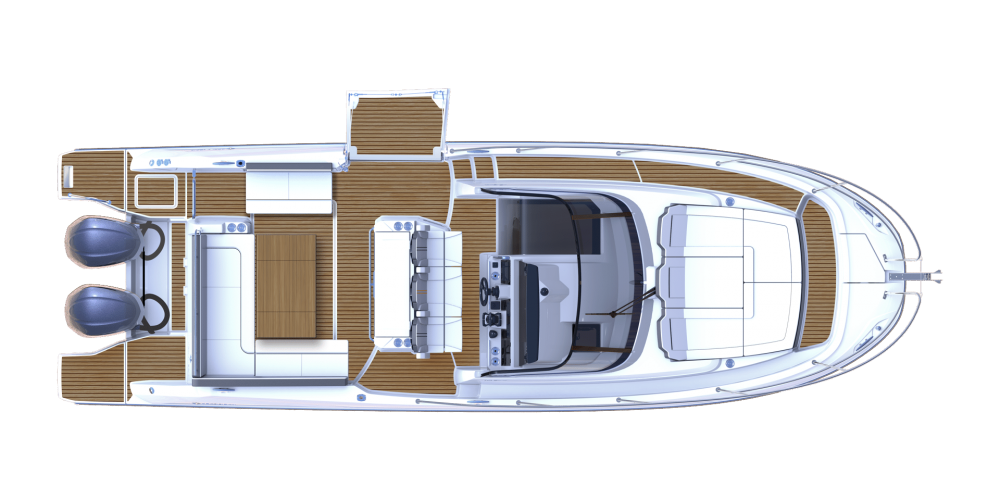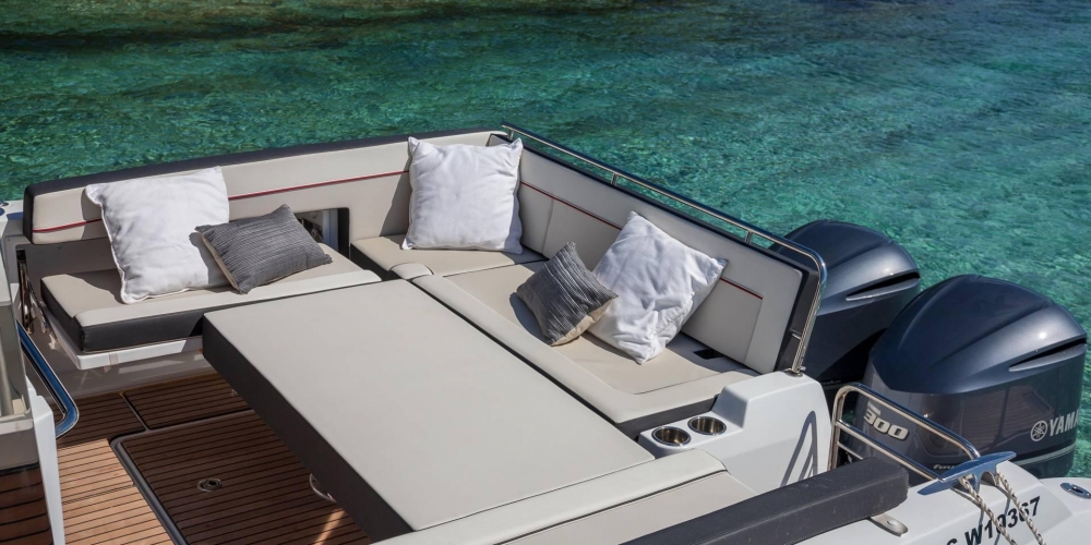 A popa, disfrute de un verdadero salón de cabina con una gran mesa rodeada de grandes bancos que dan a una hermosa cocina exterior totalmente equipada para su total disfrute. La nueva terraza lateral, con su escalera de baño, abre la cabina hacia el mar y extiende la zona de baño: un nuevo espacio que se añade a las plataformas traseras.