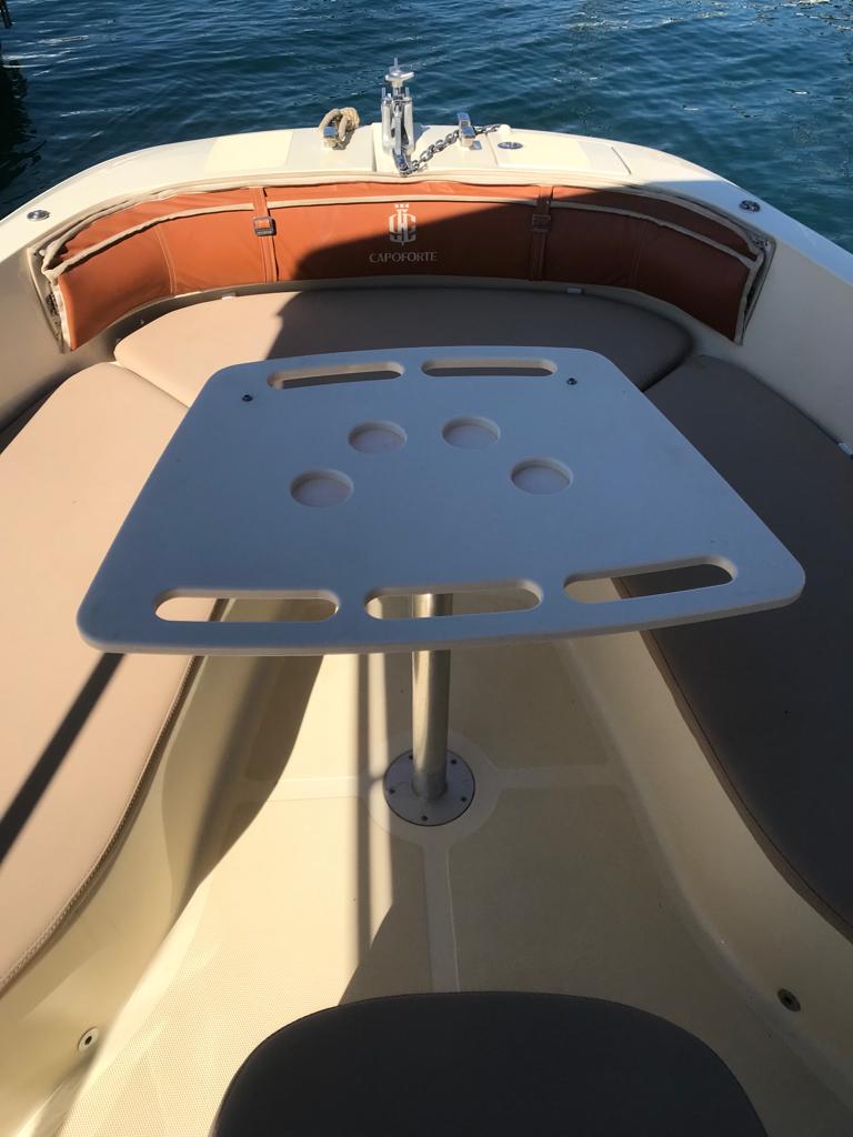 Dispone de un sofá en la popa. Los asientos del piloto y acompañante se abaten hacia adelante para acceder a la cocina. A proa dispone de un solárium para poder tumbarse/sentarse varias personas.