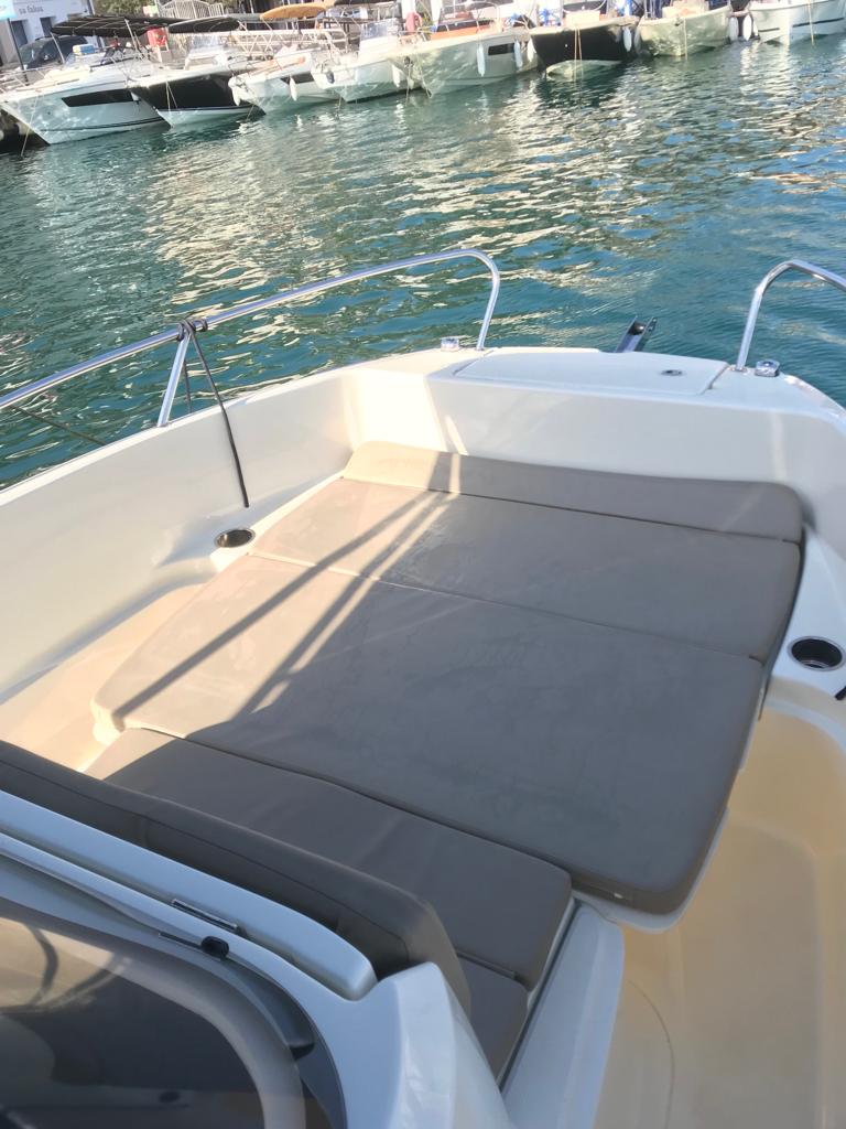 La espaciosa zona de proa se transforma en un amplio solárium en segundos. Después de disfrutar del sol, una mesa con porta bebidas integrado convierte el solárium en una zona dinette con capacidad para 4 adultos. En la popa, la bañera es el sitio perfecto para socializar gracias a los asientos pivotantes del piloto y copiloto. Para los amantes de los deportes acuáticos, el mástil de esquí está disponible para su instalación instantánea.